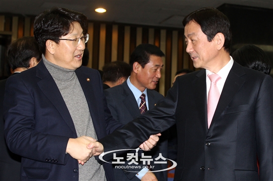23일 오후 국회 새누리당 의원총회에 인수위 부의원장을 맡고 있는 진영 정책위의장이 권선동 의원과 인사를 하고 있다.