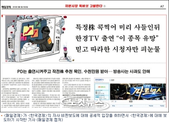 한경은 "매경은 지난 2월 2일 한국경제TV의 전 PD가 수뢰 혐의로 구속되고, 방송에 출연한 한 증권전문가가 방송 전에 미리 사둔 주식을 추천하는 방법으로 수십억원대의 부당이득을 올린 사건을 A1면과 A7면에 걸쳐 대대적으로 보도했다"고 지적했다.