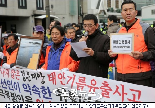 태안기름유출사고에 대한 법원의 사정 결과에 크게 실망해 민사소송 절차를 밟고 있는 태안피해주민들이 5일 서울 삼청동 박근혜 대통령 인수위 사무실 앞에서 박근혜 대통령 당선인의 약속이행을 촉구했다.