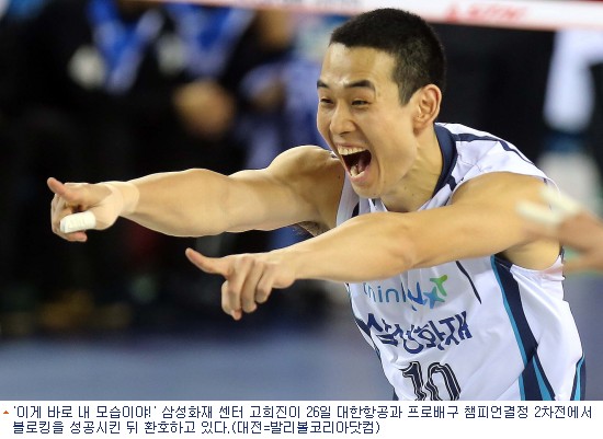 고희진은 1-1 동세트던 3세트 본격적으로 시동을 걸었다. 6-6 상황에서 상대 에이스 마틴(18점)을 블로킹한 데 이어 7-7 상황에서 김학민을 또 다시 가로막으며 기세를 올렸다. 고희진의 활약에 팀 전체 사기가 오른 삼성화재는 20점대 박빙 상황에서 박철우(9점)와 세터 유광우(2점)까지 블로킹 대열에 가세하며 세트 스코어 2-1로 전세를 뒤집었다.