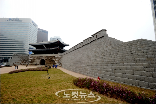 ▶숭례문 관리할 전담 관리동 설치= 가장 먼저 눈에 띄는 것은 이전에 없던 관리동이다. 지하 1층, 지상 1층에 연면적 279.73㎡의 철근콘크리트 구조물이다. 정면에서 바라보면 지상 건물이지만 후면에서는 영락없는 지하라 건물이 보이지 않는다. 숭례문의 경관을 위한 장치이다.