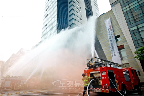 7일 오후 서울 광진구 더 클래식500 빌딩에서 열린 ''초고층 빌딩 테러·화재 대응훈련''에서 소방관들이 물을 뿌리고 있다.