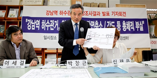 박창근 시민환경연구소 소장이 15일 오전 서울 누화동 환경재단에서 열린 강남역 하수관거 현장조사결과 발표 기자회견에서 설계 도면을 설명하며 현장조사 결과를 발표하고 있다.