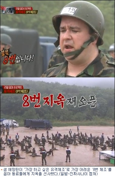 샘 해밍턴이 언급한 8번 체조는 유격 체조 중 가장 악명 높다는 ''''온몸 비틀기'''' 동작. 당황한 교관이 ''''8번 가장 하고 싶습니까?'''' 라고 재차 물었지만 그는 ''''그렇습니다''''로 일관했다. 결국 훈련생 모두 진흙 바닥에 누워 ''''지옥''''같은 8번 체조를 다시 해야만 했다.