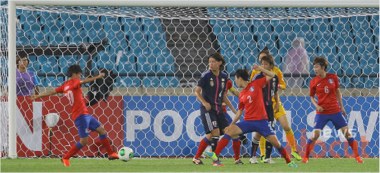27일 오후 서울 송파구 잠실종합운동장에서 열린 '2013 EAFF 동아시안컵 축구선수권대회' 대한민국과 일본의 경기에서 지소연이 일본 선수의 공을 막고 있다.
