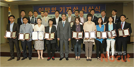 한국기자협회가 선정하는 제275회 이달의 기자상 시상식이 2일 오전 서울 중구 프레스센터에서 열렸다. 박종률 한국기자협회장을 비롯한 수상자들이 기념사진 촬영을 하고 있다.