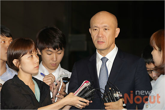 4일 새벽 전두환 비자금 수사와 관련해 검찰에 소환된 전두환 전 대통령의 차남 재용 씨가 조사를 마치고 서울중앙지검 앞에서 취재진들의 질문에 답하고 있다.