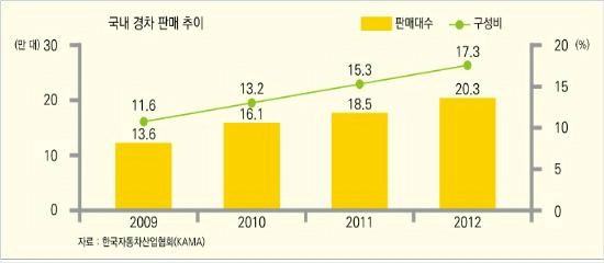한국자동차산업협회에 따르면 2012년 국내 경차 판매는 20만 2천여대로 2011년의 18만 4천여대에 비해 9.7%증가했으며 올해 경차 점유율은 17.3%로 꾸준히 증가하는 추세를 보이고 있다.