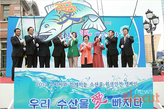 13일 오후 서울역 광장에서 열린 ‘소비자와 함께하는 수산물 위생안전 캠페인’ 에 참석한 윤진숙 해양수산부 장관(왼쪽 두번째)을 비롯한 내빈들이 수산물 위생안전 퍼포먼스를 진행하고 있다.