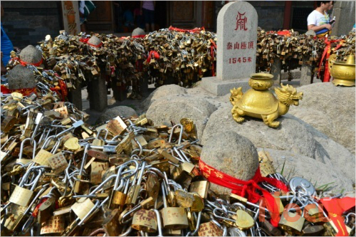 옥황정 입구에는 태산에 오르니 그 풍광이 너무 아름다워 글로 표현 할 수 없어 아무것도 새기지 않았다는 '무자비'가 새워져 있다. 최고의 칭송이다. 말을 잃어버린 풍광. 그러나 옥황정에 들어서는 순간 표지석 주변으로 헤아릴 수 없이 많은 자물쇠가 겹겹이 걸려있는 모습이 눈에 들어온다. 무자비에서 느낀 감동이 아주 조금은 퇴색됐지만 하늘아래 세상이 이처럼 자물쇠처럼 얽혀 있기에 사람들이 이곳을 찾는 게 아닐까 추측해 본다.