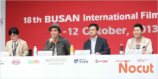 제18회 부산국제영화제가 열리고 있는 4일 부산 해운대 신세계 센텀시티에서 영화 '더 엑스' 기자간담회가 열린 가운데 김지운 감독(왼쪽 두번째)이 취재진의 질문에 답하고 있다. 사진=이명진 기자