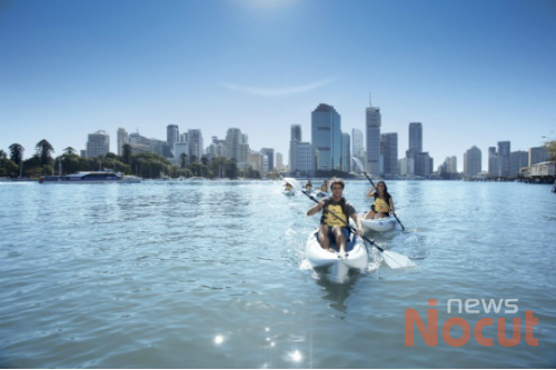 여행객이 브리즈번 강에서 카약킹을 즐기고 있다.