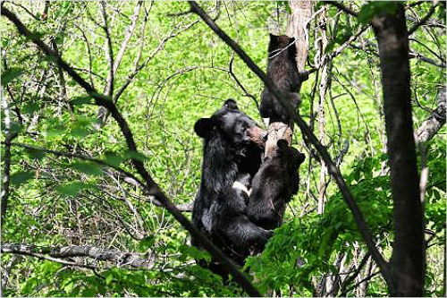 어미곰에게 나무타기를 배우는 새끼 반달가슴곰.(국립공원관리공단 제공)