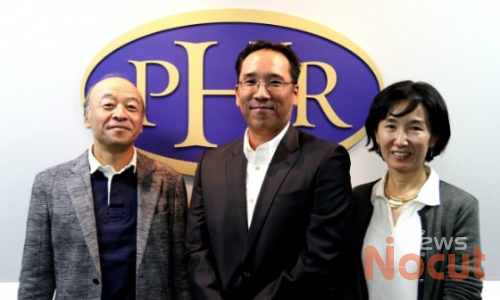 괌 국제마라톤대회 홍보차 방한한 켄 야나기사와 PIC괌 총지배인(中)이 기념촬영을 하고 있다.