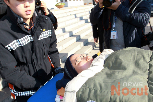 정당해산심판 청구에 맞서 삭발 단식 농성중인 통합진보당의 의원들 중 김미희 의원이 건강악화로 단식 15일째인 20일 오전 국회 본청 농성장에서 응급 구조대의 도움을 받아 구급차로 이동하고 있다.