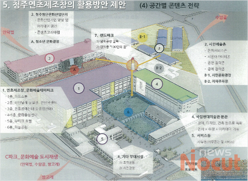또 옛 청주연초제조창 내 동부창고 3만㎡에는 2017년까지 80억원을 들여 예술자료 아카이브·다목적 회의실·레스토랑·카페·시민휴식공간 등을 갖춘 문화서비스존과 동아리 활동 공간과 시민창작공간 등을 갖춘 시민아카데미존, 공연예술 창작·무대공연의 장 등을 갖춘 공연 창작촌, 아트&디자인 창작존 등의 시민예술촌을 만든다.