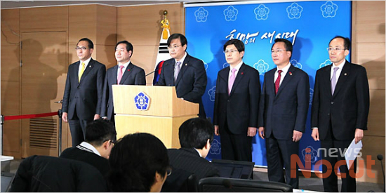 서승환 국토교통부 장관이 11일 오후 서울 종로구 정부종합청사에서 한국철도공사 노조 파업 관련 대국민담화문을 발표하고 있다. 왼쪽부터 홍윤식 국무조정실 제1차장, 유정복 안행부 장관, 서 장관, 황교안 법무부 장관, 방하남 고용노동부 장관, 추경호 기재부 1차관.