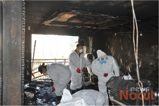 일가족 4명의 목숨을 빼앗은 부산 북구 화명동 화재사건 감식장면.(부산 북부경찰서 제공)
