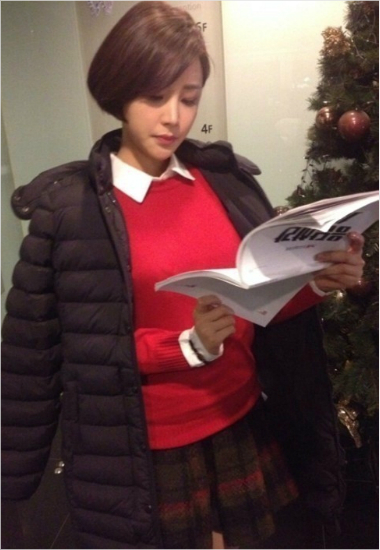 사진 속 윤진이는 깜찍한 단발머리에 니트와 스커트를 매치한 귀여운 모습으로, 인형 외모를 과시하고 있다.