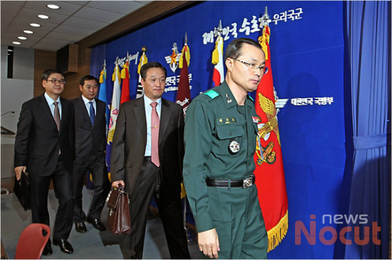 백낙종 국방부 조사본부장(오른쪽에서 두번째)이 19일 오전 서울 용산구 국방부에서 사이버사령부 심리전 부대인 530부대 이모 단장이 정치글 작성을 지시했다는 내용의 수사결과를 발표한 후 브리핑실을 나서고 있다.