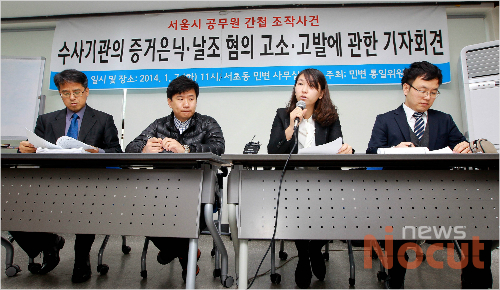 민주사회를위한변호사모임 통일위원회가 7일 오전 서울 서초동 민변 사무실에서 서울시 공무원 간첩 조작사건 관련 '수사기관의 증거은닉 날조 혐의 고소 및 고발에 관한 기자회견'을 하고 있다.