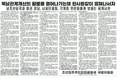 한편, 북한 국방위는 이날 김정은 제1비서의 특명에 따른 '남조선 당국과 여러 정당, 사회단체, 각계층 인민에게 보내는 공개서한'을 발표하고 "지난 16일 발표한 국방위의 중대제안이 위장평화공세와 선전심리전이 아니다"고 밝혔다.