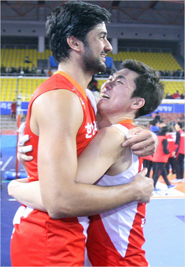 '왜 이제야 왔니?' 한국전력 전광인(오른쪽)이 29일 현대캐피탈과 원정에서 3-0 완승을 거둔 뒤 비소토를 껴안고 기쁨을 나누고 있다.(천안=한국전력)