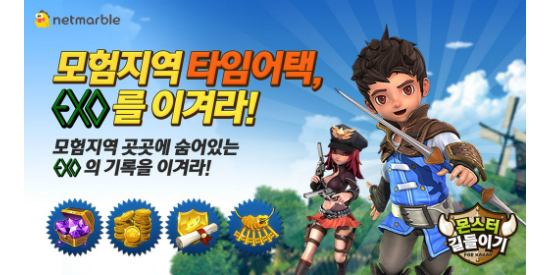 CJ E&M 넷마블은 오는 20일까지 모바일게임 ‘몬스터 길들이기 for 카카오’(몬스터 길들이기)에서 인기 그룹 엑소와 함께하는 타임어택 행사를 진행한다.