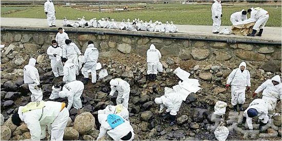 일손돕기에 참여한 임직원들은 썰물 때만 작업해야하는 시간의 제한으로 마을해안과 제방 등에 묻어 있는 기름찌꺼기를 최대한 신속하게 닦아 내며 구슬땀을 흘렸다.