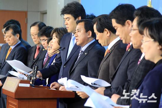 민주당 서울시의회 의원들이 11일 오전 국회 정론관에서 안철수 측 새정치신당의 민주당 광역의원 빼가기 중단을 촉구하는 기자회견을 하고 있다.