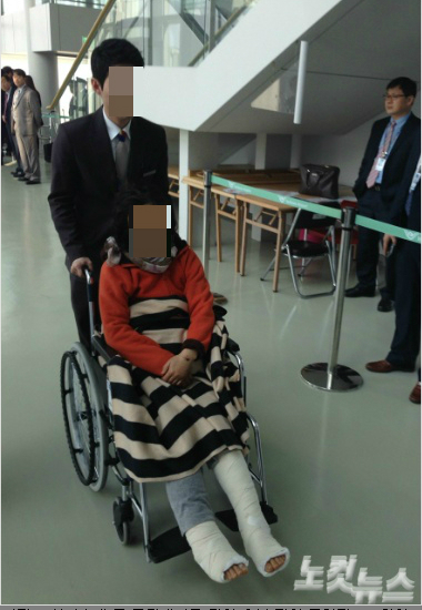 이집트 성지순례 중 폭탄테러를 당한 충북 진천 중앙장로교회의 한 신도가 다리에 붕대를 감은 채 귀국하고 있다.(사진=이대희 기자)