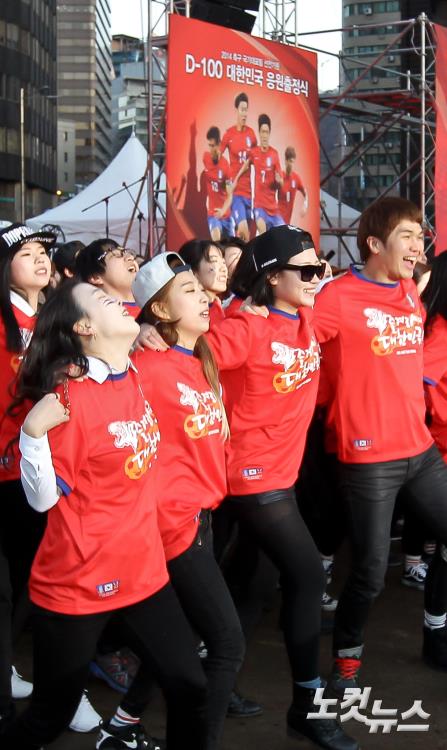 5일 오후 서울광장에서 열린 2014 브라질월드컵 D-100 붉은악마 응원 출정식에서 서울예술종합학교 학생들이 응원전을 펼치고 있다.