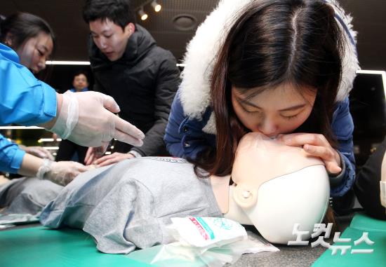 제393차 민방위훈련이 실시된 14일 오후 서울시청 시민청에서 시민들이 심폐소생술을 체험하고 있다.