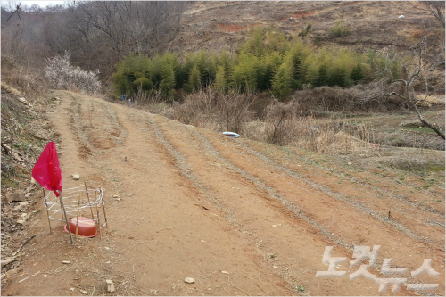 11일 두 번째 운석이 발견된 진주시 미천면 오방리 박모 씨의 밭. 운석이 발견된 지점에 표시를 해 뒀다. 산쪽에 운석을 찾아나선 탐사객들이 보인다.
