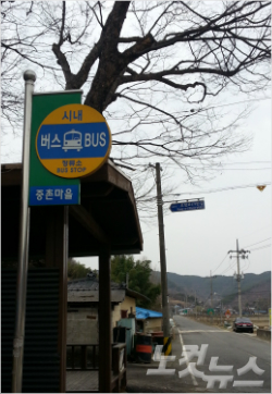 중촌마을을 알리는 시내버스 표지판. 뒤쪽에 비스듬히 경사져 있는 야산에서 세 번째 운석이 발견됐다.