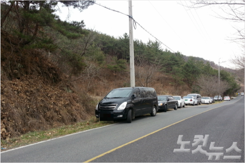 16일 세 번째 운석이 발견된 장소 인근 지방도 1007호에 운석을 찾는 외지인들의 차량들이 줄지어 있다.