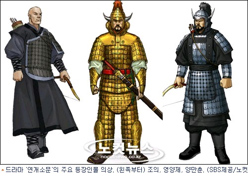 물론 모티브를 얻는 대상도 다르다. ''연개소문'' 의상은 1년여에 걸친 역사서 수집, 복원을 거쳐 완성됐다. 고증을 통해 연개소문 장군이 착용할 바지갑옷과 뿔 달린 투구는 이 드라마를 통해 첫 선을 보인다.