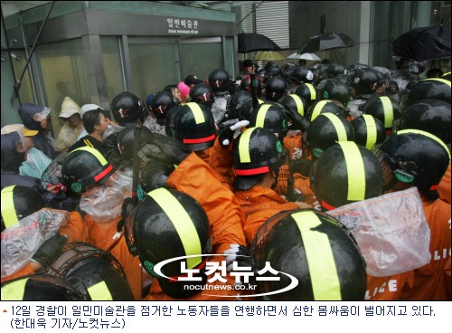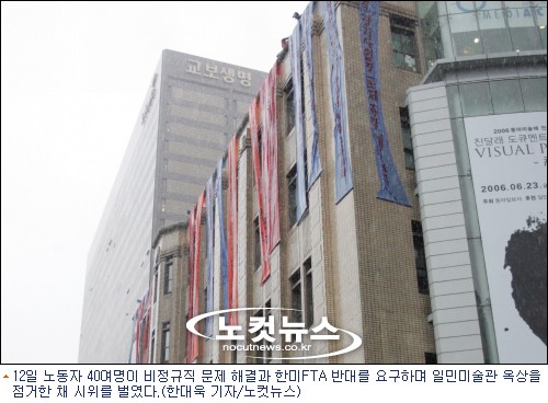 KTX 여승무원 노조와 코오롱노조 등 비정규직 문제로 장기투쟁을 벌여온 노동자 40여명이 12일 오전 9시부터 서울 광화문 일민미술관 건물 옥상에 올라가 시위를 벌였다.