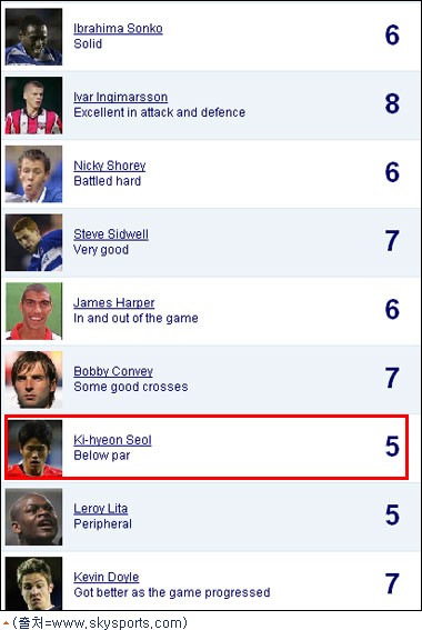 레딩FC는 잉글리시 프리미어리그 두번째 승리를 따냈지만 팀의 주요 공격 옵션으로 자리잡은 설기현은 최저 평점을 받았다.