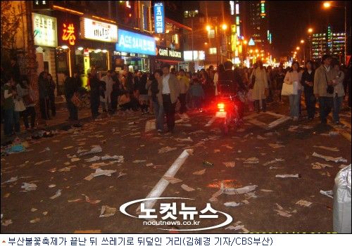 모래 위에 깔고 앉았던 신문지와 먹다 남긴 음식 쓰레기는 백사장은 물론 이면도로와 행사장에서 한참 떨어진 지하철역까지 뒹굴었다.