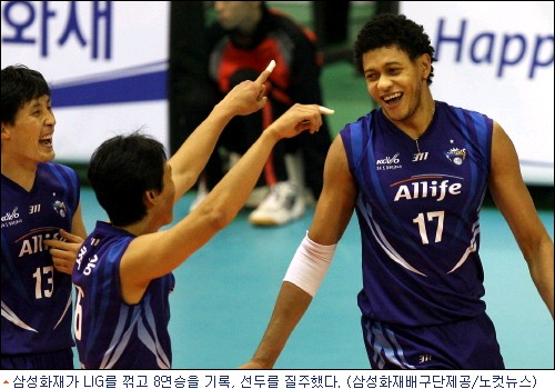 삼성화재가 27일 구미 박정희체육관에서 열린 2006~2007 힐스테이트 V리그 LIG와의 경기에서 외국인선수 레안드로의 득점포를 앞세워 3-2(25-22 17-25 25-22 22-25 15-7)로 승리했다.