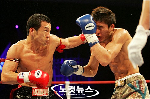 임치빈이 18일 오후 서울 올림픽 공원 올림픽 홀에서 열린 K-1 파이팅 네트워크 칸 2007 챔피언쉽대회 8강에서 사무카와 나오키를 맞서 강한 펀치를 날리고 있다. 임치빈은 첫째딸 생일을 맞아 4강이라는 선물을 안겨줬다.