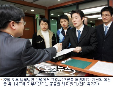 [고영씨 "부의 대물림 당연시되는 현실에서 작은 사례가 됐으면"] 유니세프 장성윤 팀장은 "우리 나라에서는 재산을 남긴다는게 자식들에게만 한정되는 경우가 많다"며 "이번 고영씨의 경우는 돈이 많은 사람만이, 나이 든 사람 만이 유산 기부를 하는 것이 아니라 돈이 많지 않아도 또 나이가 젊더라도 얼마든지 유산을 기부할 수 있다는 의미를 가진다"며 "이를 계기로 많은 사람들이 동참했으면 좋겠다"고 말했다.
