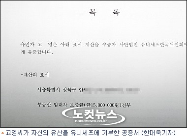 유언장에는 현재 자신이 살고 있는 7평짜리 원룸 전세 계약금인 1500만원을 유엔아동기금인 유니세프에 기증한다는 내용이 담겨 있다.