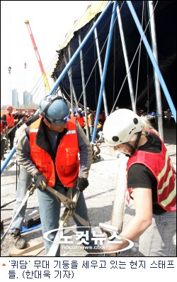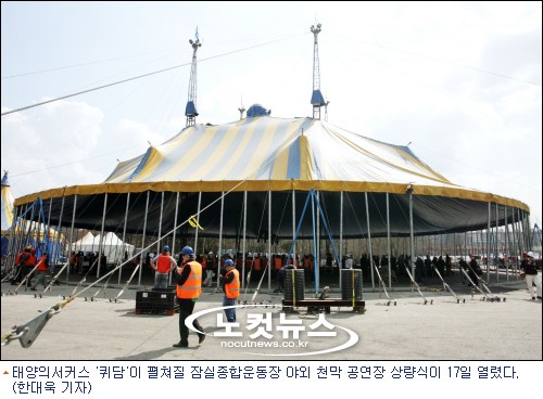 29일 첫 내한공연 앞두고 17일 60여명 인력 동원해 야외 무대 기둥 세우는 상량식 ☞ 태양의서커스 ''퀴담'' 하이라이트서커스의 화려함에 컴퓨터 장비를 활용한 현대적인 테크놀로지와 매혹적인 무대 디자인이 결합, 환상적인 무대를 선사할 ''''퀴담''''은 강렬한 음악과 함께 마치 판타지 소설 같은 내용이 어우러진 새로운 형식의 투어 공연으로, 이번 첫 내한 소식은 벌써부터 화제가 되었다.