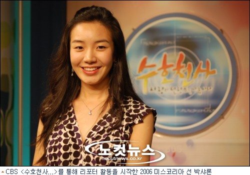 박샤론은 작년 대회 입상 당시 ''''순수한 자연 미인''''이란 평가 속에 네티즌들의 열광적인 지지를 받았다. 이후 미스코리아로서 바쁜 일정을 소화해 가면서 <수호천사>의 리포터로 나서게 된 것은 봉사에 대한 그의 열정 때문. 박샤론은 다일공동체 홍보대사로 캄보디아 ''''밥퍼 사역''''에 참여하는 등 크고 작은 봉사 현장에서 적극적으로 활동해 왔다.