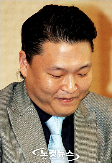 병역특례 비리 의혹이 드러난 가수 싸이(본명 박재상)가 18일 오후 서울 여의도 63빌딩 체리홀에서 기자회견을 도중 미소짓고 있다. 싸이는 "이제 한 여자의 남편이고 오는 10월이면 쌍둥이의 아빠가 된다"면서 "떳떳한 모습의 아빠가 되고 싶다"고 밝혔다.