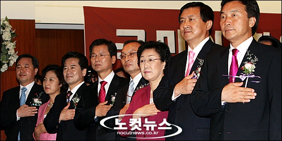 27일 오전 서울 여의도 CCMM에서 열린 대통합민주신당 국민참여운동본부 발대식 및 아름다운 경선 서약식에서 후보들이 국민의례를 하고 있다. (왼쪽부터)김두관, 추미애, 정동영, 천정배, 이해찬, 한명숙, 신기남, 손학규.