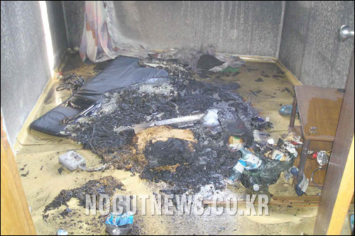 오씨는 즉시 김씨의 목을 조르고 마구 때려 실신시킨 뒤 현금 100만원을 빼았았으며 화재사고로 위장하기 위해 실신한 김씨를 방에 밀어넣은 뒤 자신이 투숙하던 방과 김씨의 방 등 3군데에 라이터로 불을 지른 것으로 드러났다.
