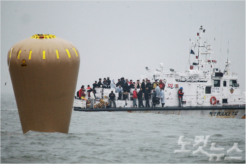 전남 진도군 관매도 인근 해상에서 침몰한 여객선 세월호의 위치를 확인하기 위한 대형 부표가 설치된 가운데 18일 오후 사고 인근해상을 찾은 실종자 가족들이 부표주위를 바라보고 있다. (윤창원 기자/자료사진)